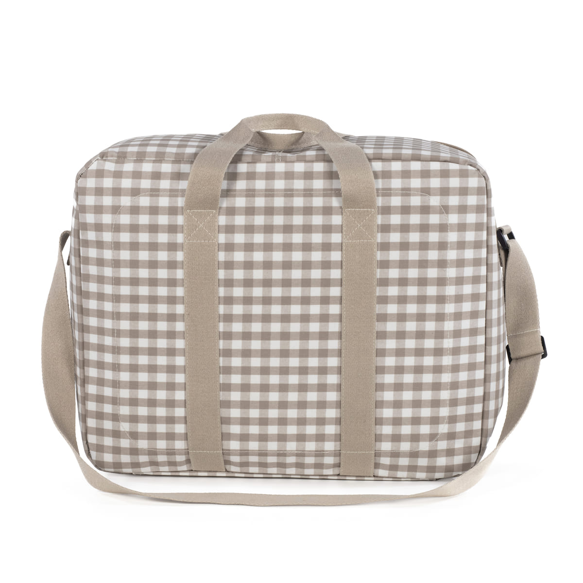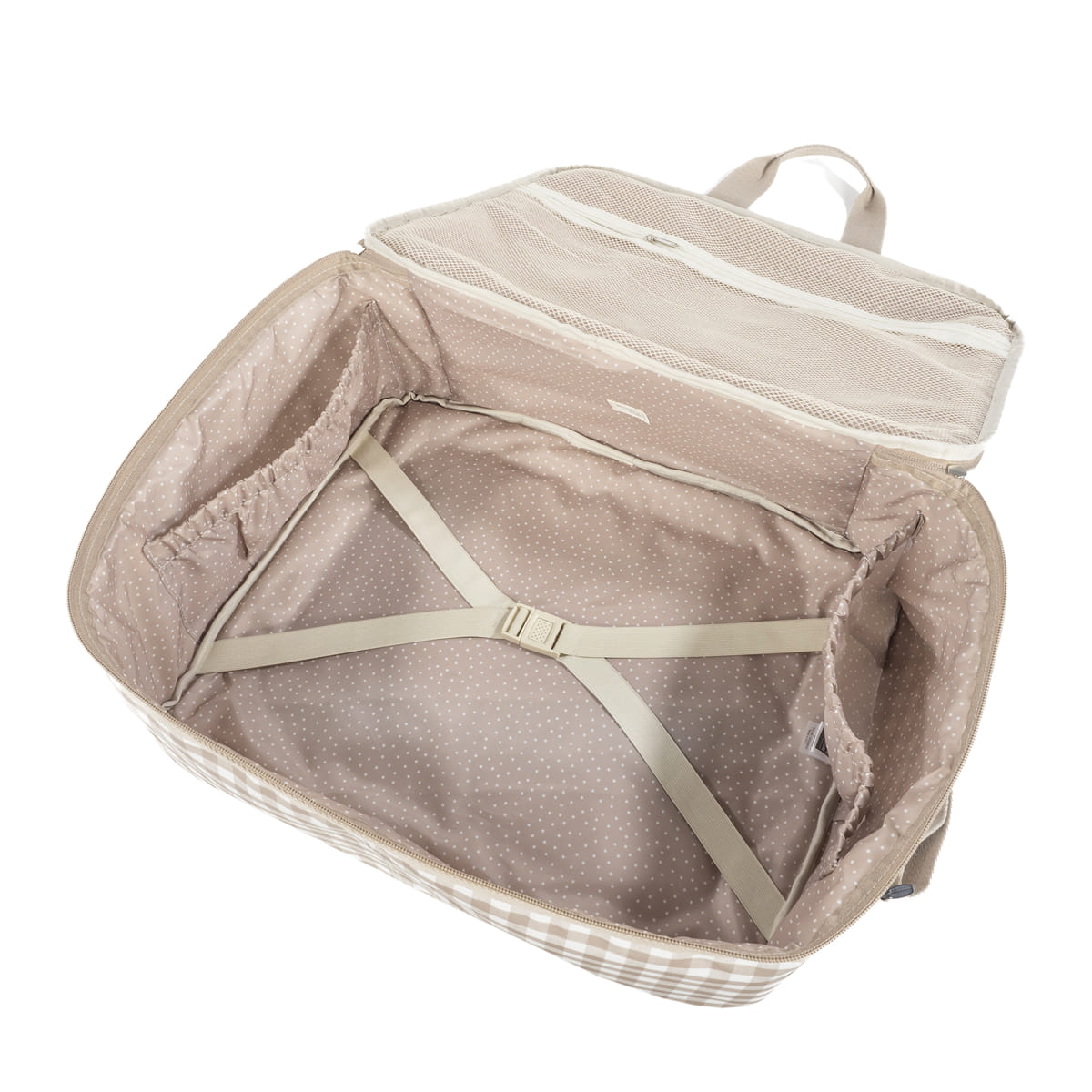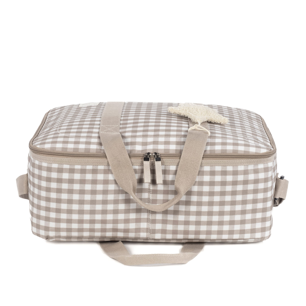 La Valigia Caetana Sand Walking Mum è pensata per accompagnare le famiglie nei primi viaggi e nelle notti fuori casa, con uno stile delicato, naturale e senza tempo. Il motivo a quadretti vichy color sabbia, abbinato ai dettagli tessili tono su tono e al morbido ciondolo a forma di stella, trasmette immediatamente un senso di calma, cura e accoglienza.