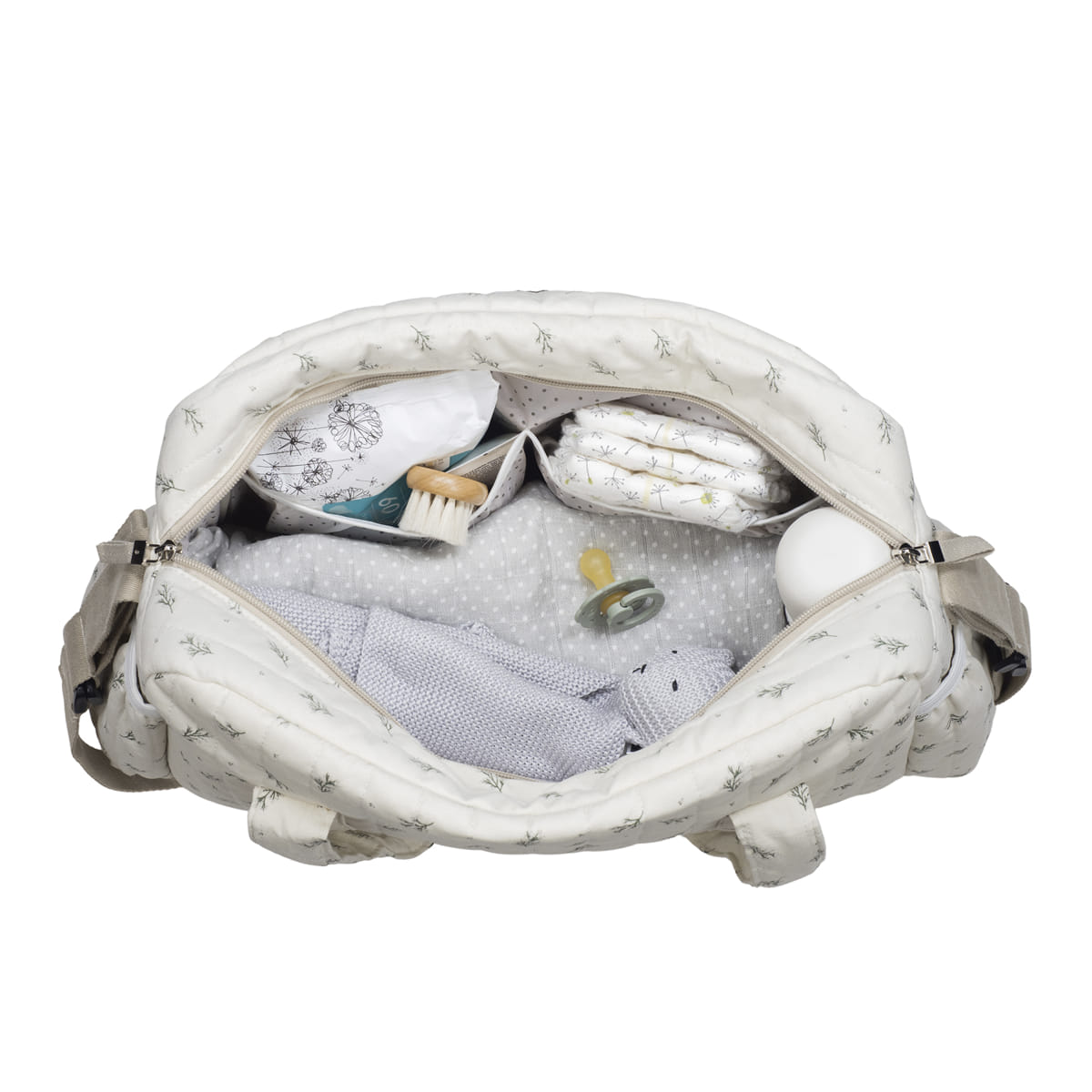 Capiente e ben organizzata, consente di portare con sé tutto l’essenziale del bambino — pannolini, salviettine, cambi, accessori e oggetti personali — mantenendo ordine e accessibilità in ogni momento.