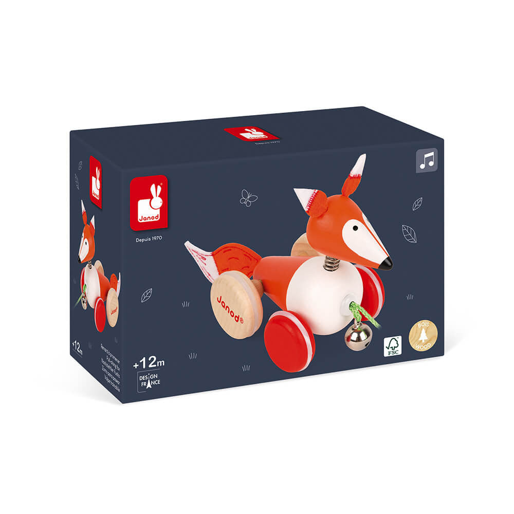 Con il suo design dolce e riconoscibile, la volpina si muove seguendo il bambino grazie al cordino da traino, mentre il campanellino integrato emette un suono delicato che incoraggia l’esplorazione. Le ruote in legno scorrono facilmente e la testa con molla ammortizzata aggiunge un tocco giocoso e dinamico.
