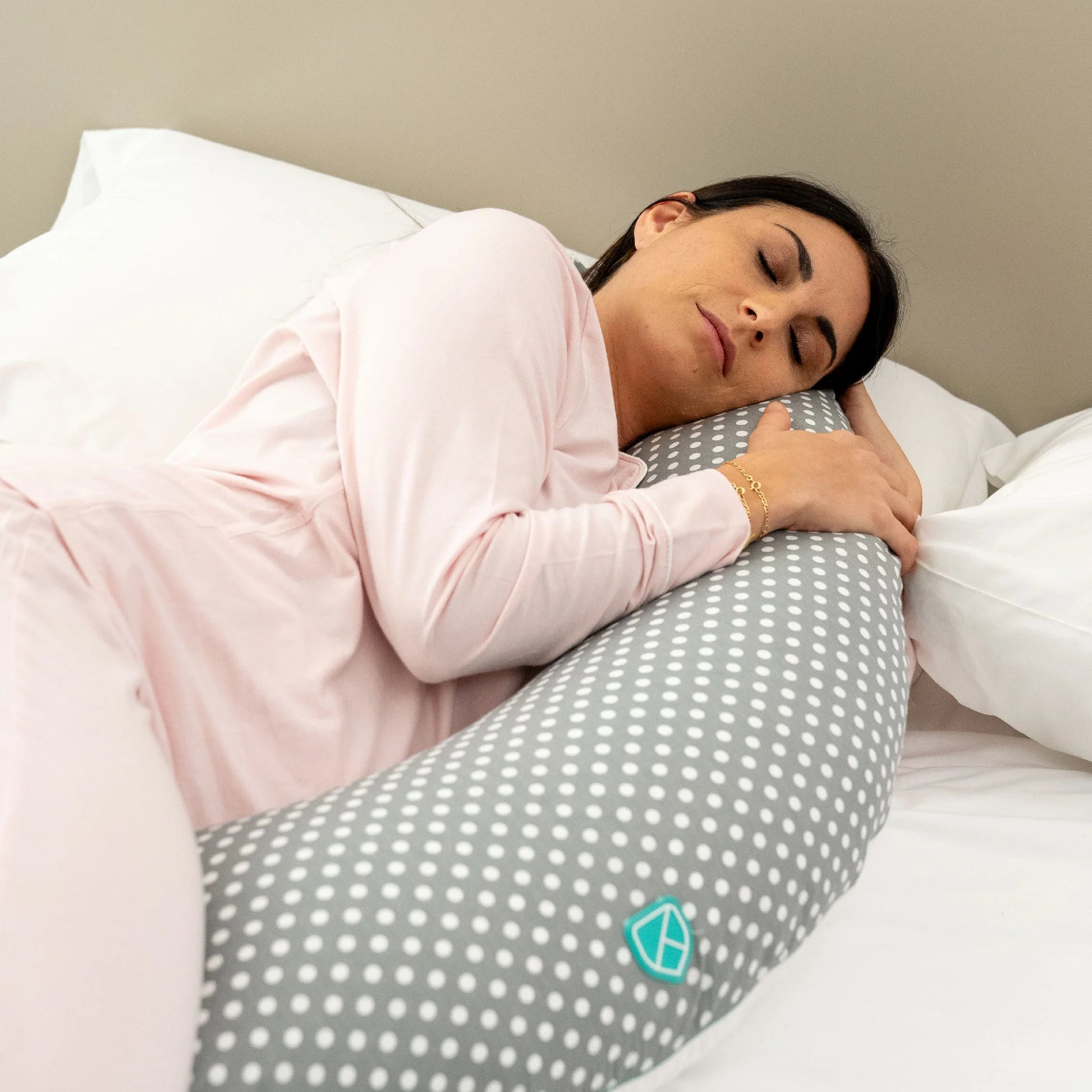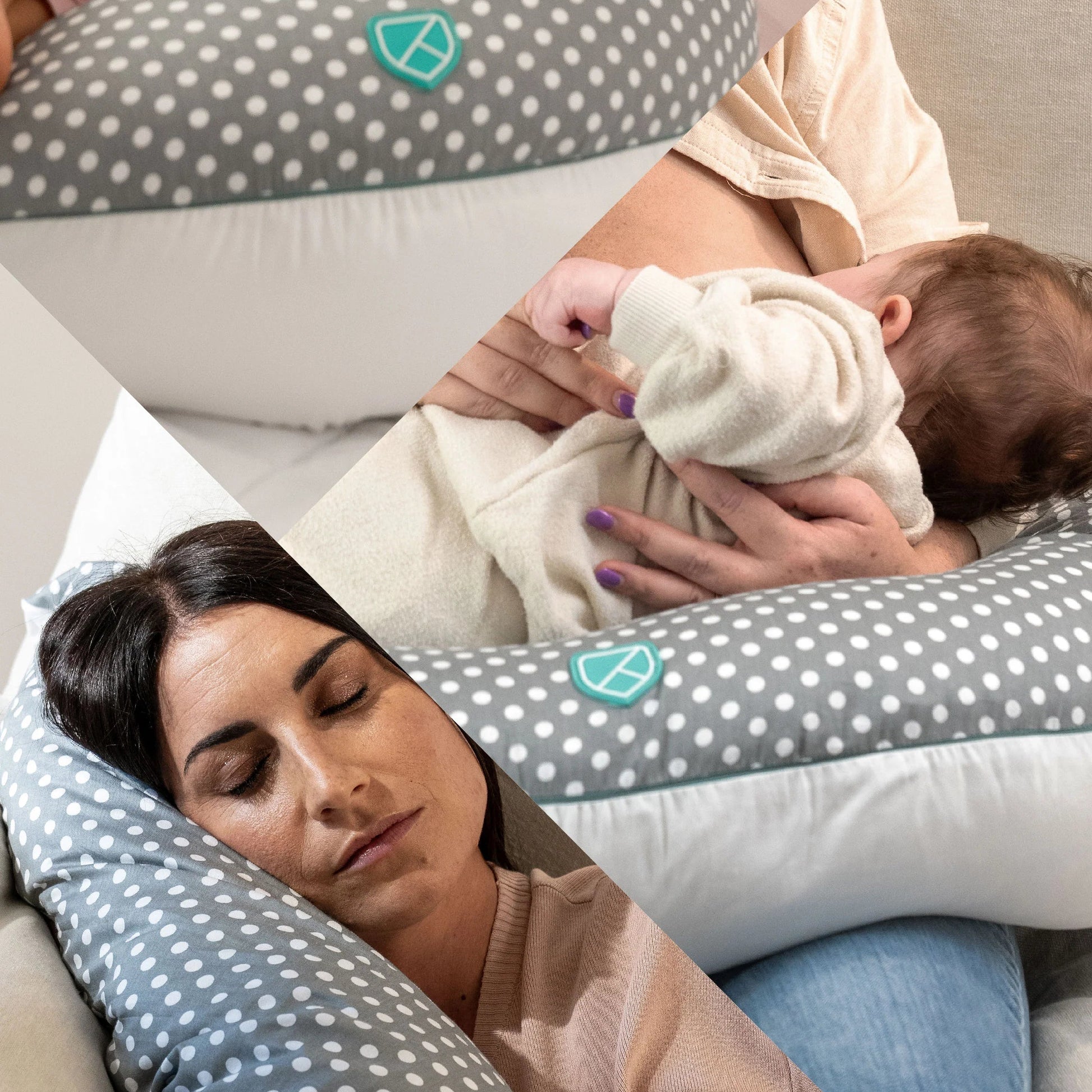 Il Koala Hugs - Cuscino gravidanza e allattamento blu con pallini bianchi accompagna la mamma prima e dopo la nascita, trasformando il riposo e l’allattamento in momenti di benessere e serenità.