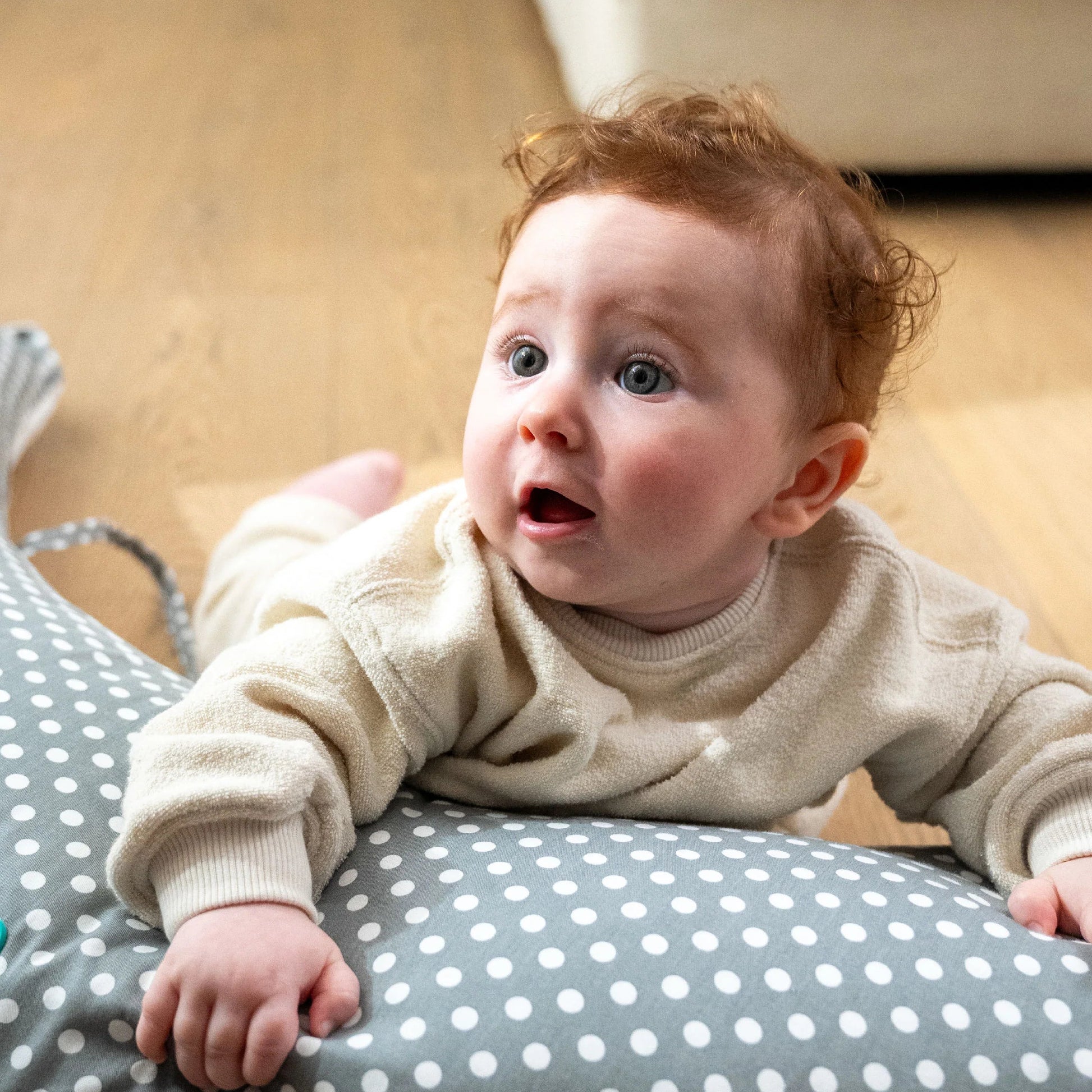 Dopo il parto diventa un valido alleato durante l’allattamento, offrendo un appoggio stabile per il bambino e riducendo la tensione su braccia e spalle. Il design blu con pallini bianchi, dolce e delicato, si inserisce con armonia in ogni ambiente della casa.