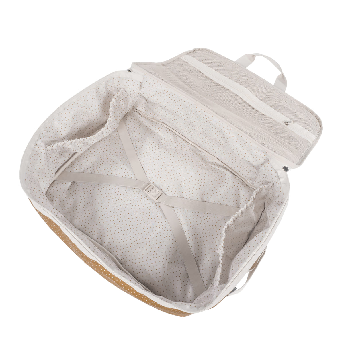 L’interno ampio e ben organizzato consente di sistemare con facilità vestiti, accessori, copertine e tutto il necessario per il bambino, mantenendo ogni cosa al suo posto grazie alle cinghie ferma-abiti.