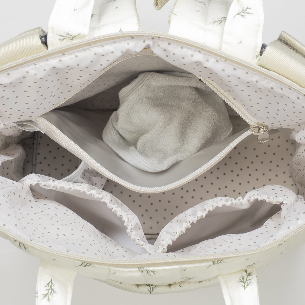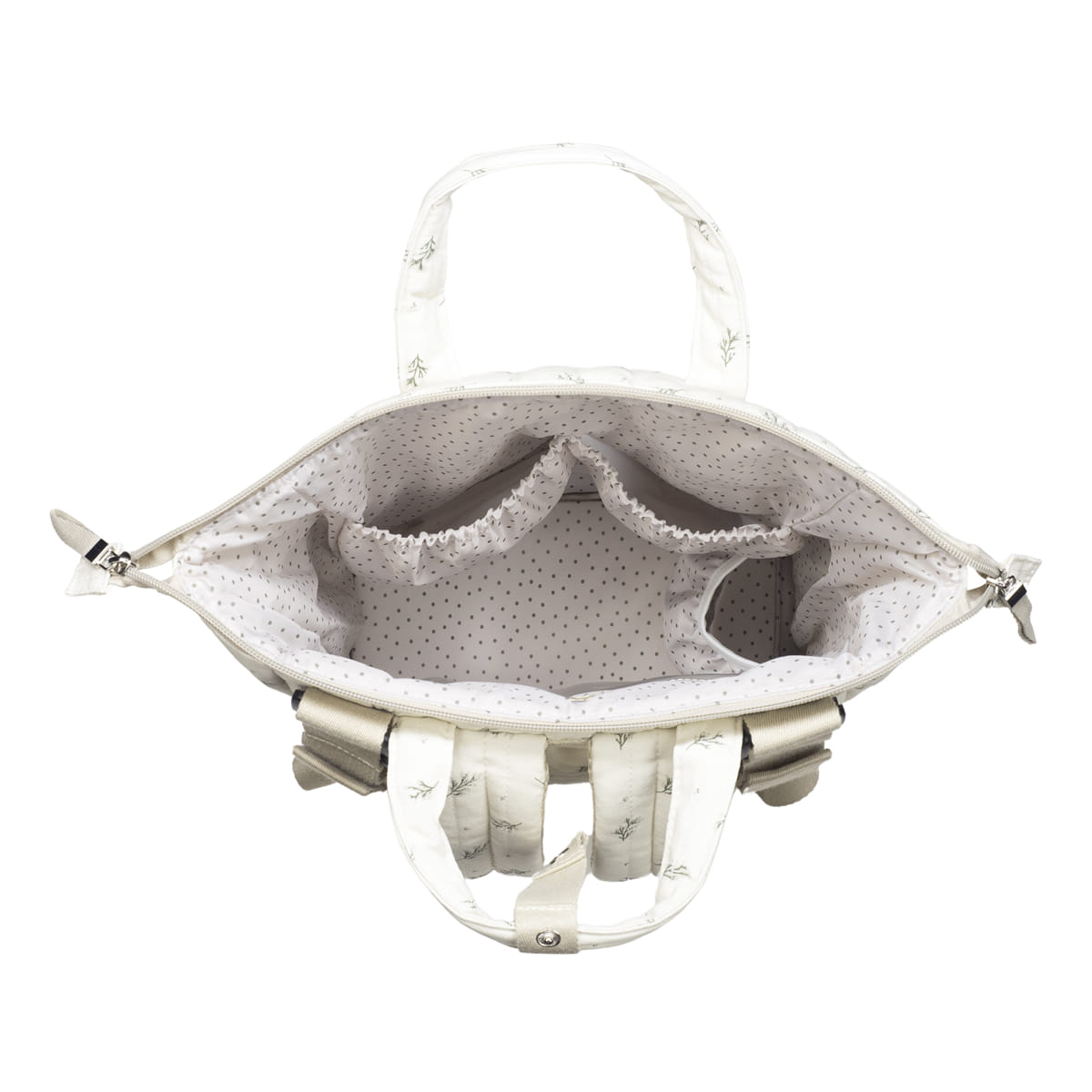 Il tessuto trapuntato color avorio con motivo mimosa verde dona un aspetto elegante e pulito, perfetto per chi ama uno stile soft e contemporaneo. La struttura ampia e ben organizzata permette di trasportare tutto il necessario per il bambino — pannolini, cambi, biberon e accessori — mantenendo sempre ordine e praticità.